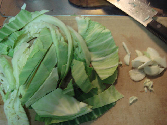 - 肉に赤いところが無くなった時点でキャベツを投入。